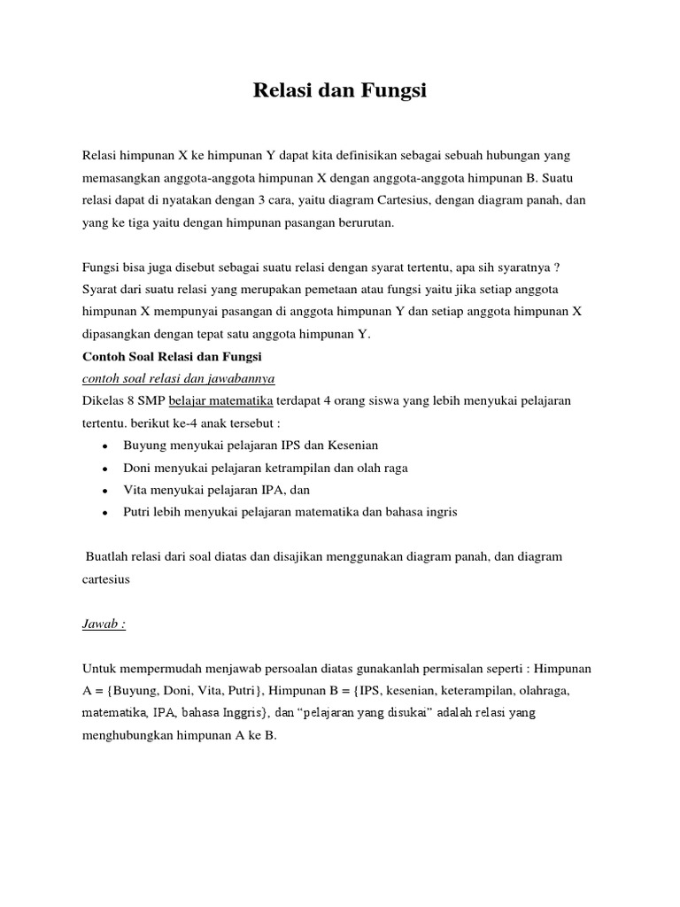 Contoh soal dan pembahasan relasi himpunan. Contoh soal ulangan relasi dan fungsi beserta jawabannya. Penjelasan soal contoh pembahasan. Kesimpulannya setiap relasi belum tentu fungsi namun setiap fungsi pasti merupakan relasi.