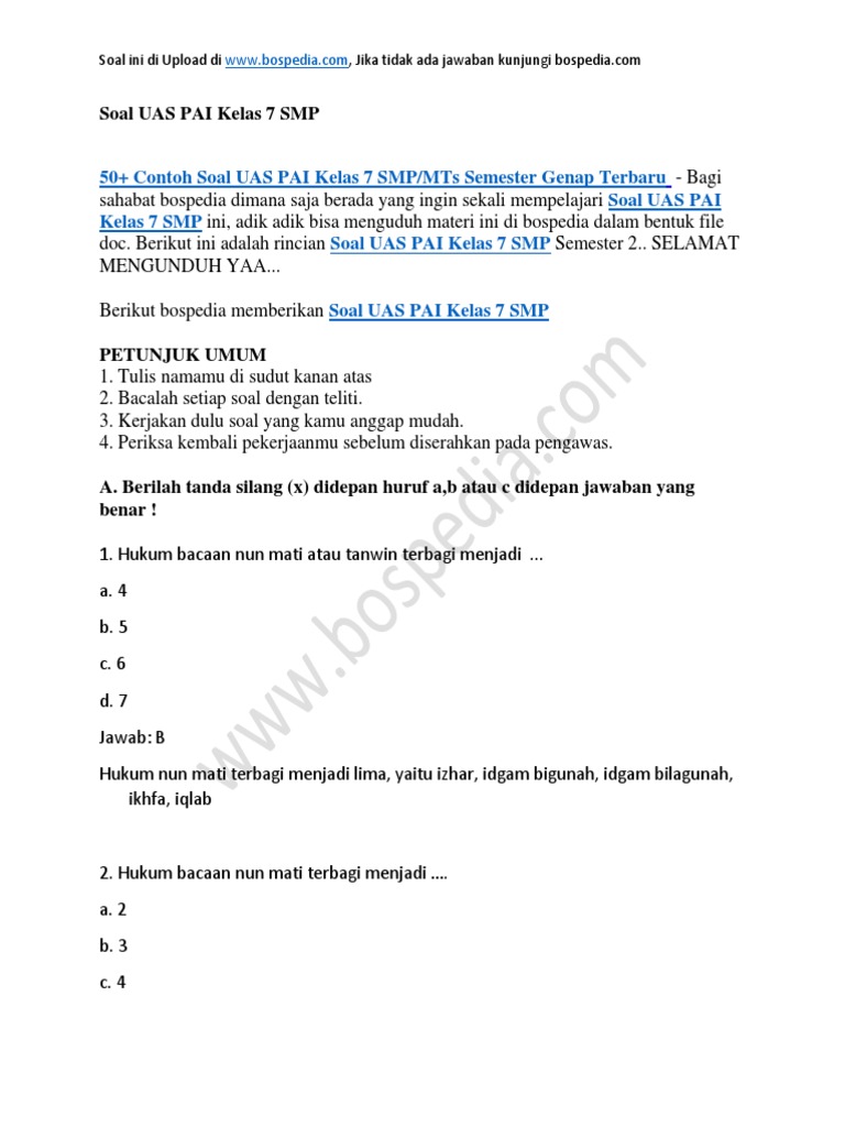 Pilihlah salah satu jawaban yang benar dari pilihan jawaban yang tersedia. Contoh soal latihan ulangan mata pelajaran pendidikan agama islam pai kelas 7 semester 1 untuk menghadapi ulangan semester 1 baik pas maupun uas sesuai kisi kisi yang terbaru tahun ajaran 20182019.
